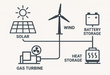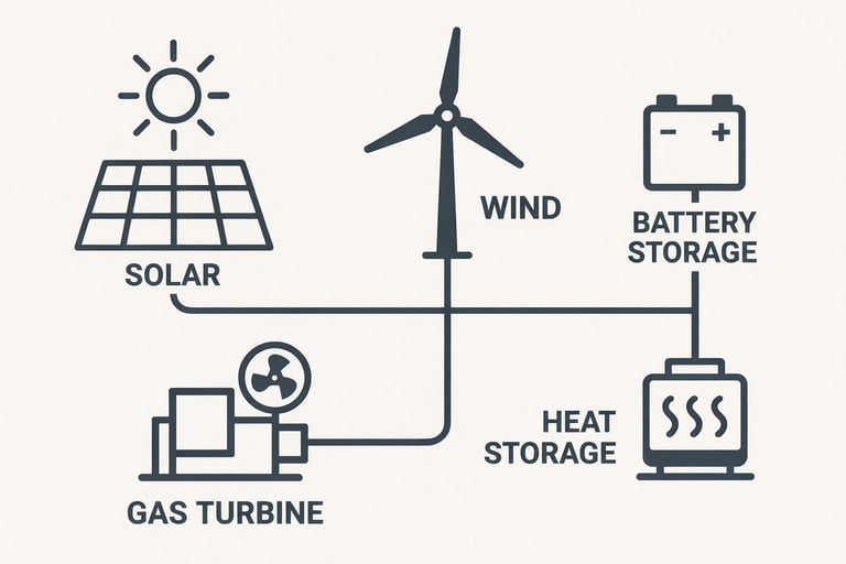 Support for integrating cycles including renewable (solar and wind), storage (battery, heat, compressed air) and gas turbine energy