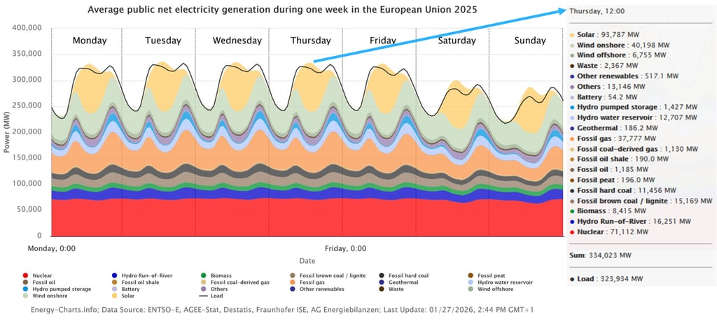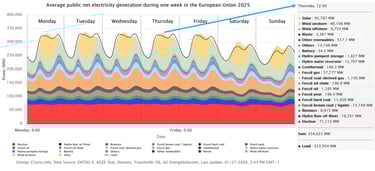 The mix of power generation drives load, as seen in the chart below showing the average weekly source of generation in the EU in all of 2025.