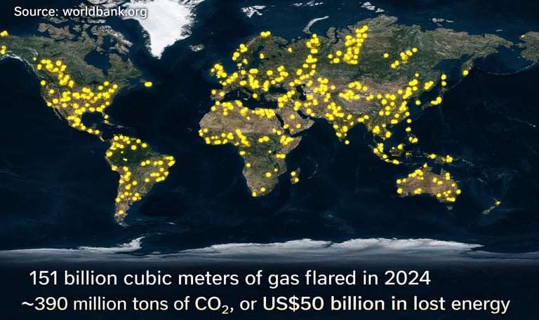 Existing power generation equipment can be retrofitted to harness the benefits of fuel flexibility. 151 billion cubic meters of gas was flared (wasted) in 2024, as tracked by the World Bank in the figure below.